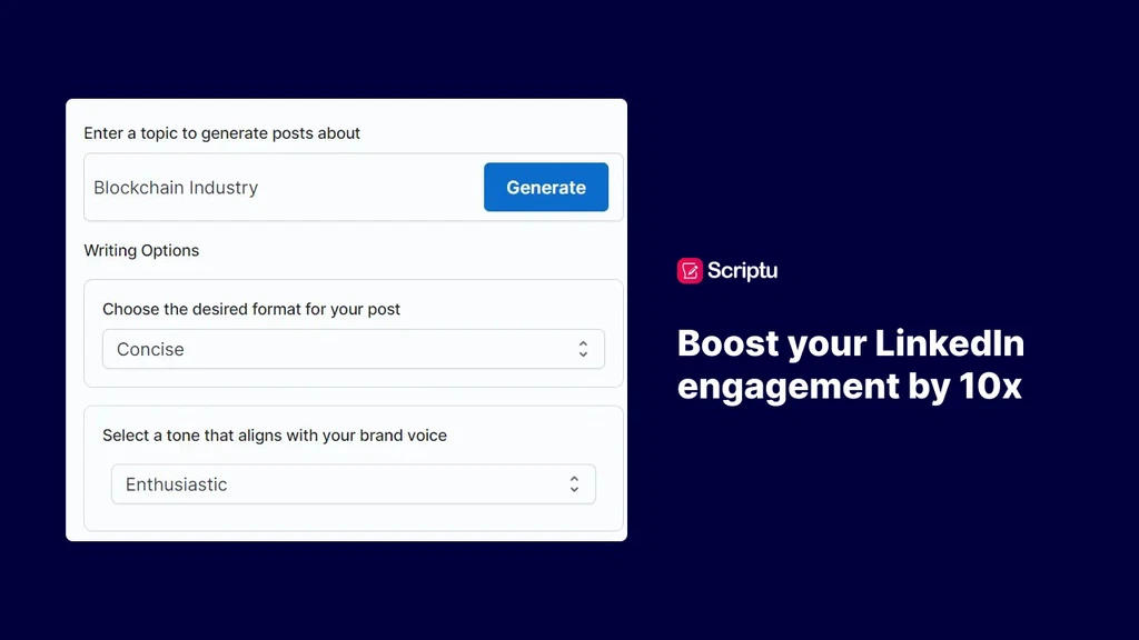 By creating high-quality, relevant content, Scriptu helps boost your LinkedIn engagement. More likes, comments, and shares can lead to increased visibility and a stronger network. Engaging content is essential for building a robust LinkedIn presence, and Scriptu’s AI-powered content creation ensures that your posts are tailored to your audience’s interests and preferences. This can help you build a more engaged and loyal following on LinkedIn.